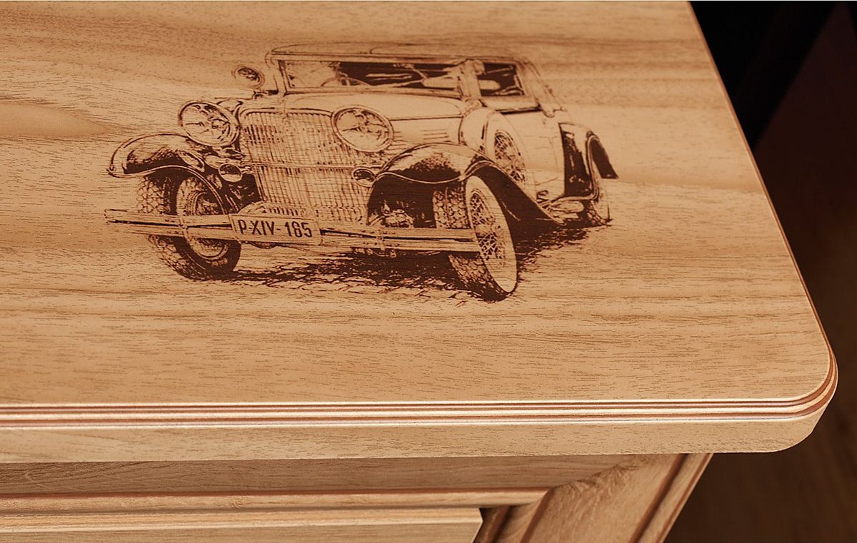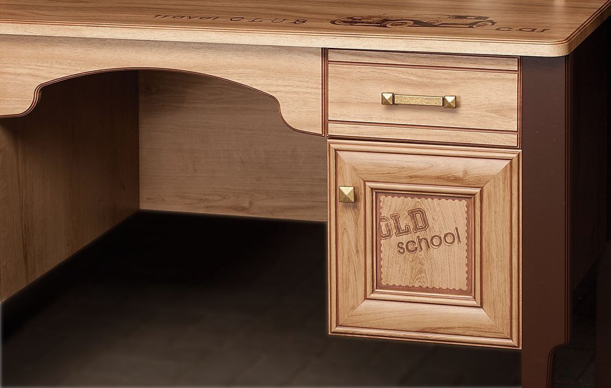 Мебель для детской комнаты «Ралли» – вариант мебели для мальчика, выполненной на базе модулей «Алиса». В основу дизайна модели положена тема гонок и ретро-машин, которыми украшены фасады. Это удачная альтернатива морской темы, так популярной в классической мебели. Кроме того в дизайне угадываются черты стиля Кантри, благодаря использованию древесного декора и патины на фасадах.