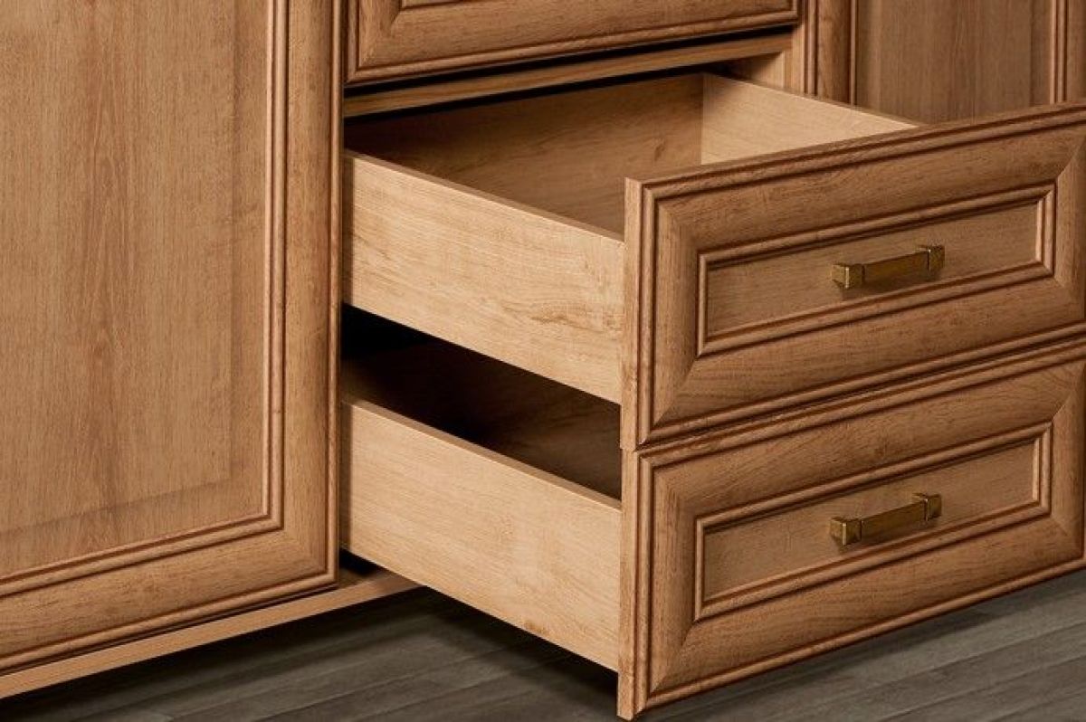 Мебель весьма практична в использовании, благодаря износоустойчивым материалам на горизонтальных поверхностях, качественным металлическим ручкам и надежной фурнитуре «Hettich». Для плавного и бесшумного закрывания дверей шкафы комплектуются амортизаторами ударов.
