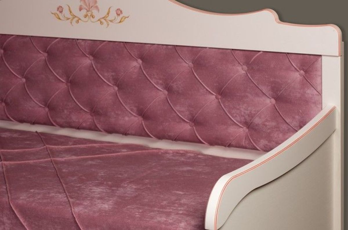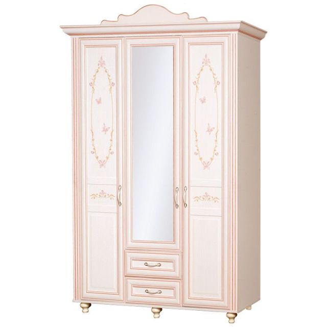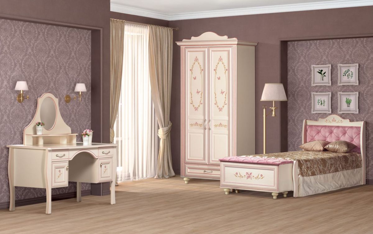 Мебель для детской комнаты «Алиса» – мебель для девочек и девушек, стилизована под Прованс, который поддержан светлым декором, цветочными рисунками и патиной на фасадах. При создании детской использовались приемы итальянского декорирования мебели. Мотивы классической росписи в сочетании с любимым мотивом детского рисунка – бабочки и цветы – создают ощущение юности и нежности. Использование декоративных элементов – корон и карнизов в наборе мебели не перегружают интерьер детской комнаты и при этом создают ощущение интерьера маленькой принцессы. Изящные ручки под золото со вставками молочно-белого цвета идеально сочетаются с кремово-белым декором и золотистой палитрой рисунков вензелей. При всей внешней легкости и утонченности мебель весьма практична в использовании, благодаря надежной фурнитуре «Hettich». Еще одним плюсом детской «Алиса» является большое количество различных модулей, позволяющих собрать комплект для любой комнаты.