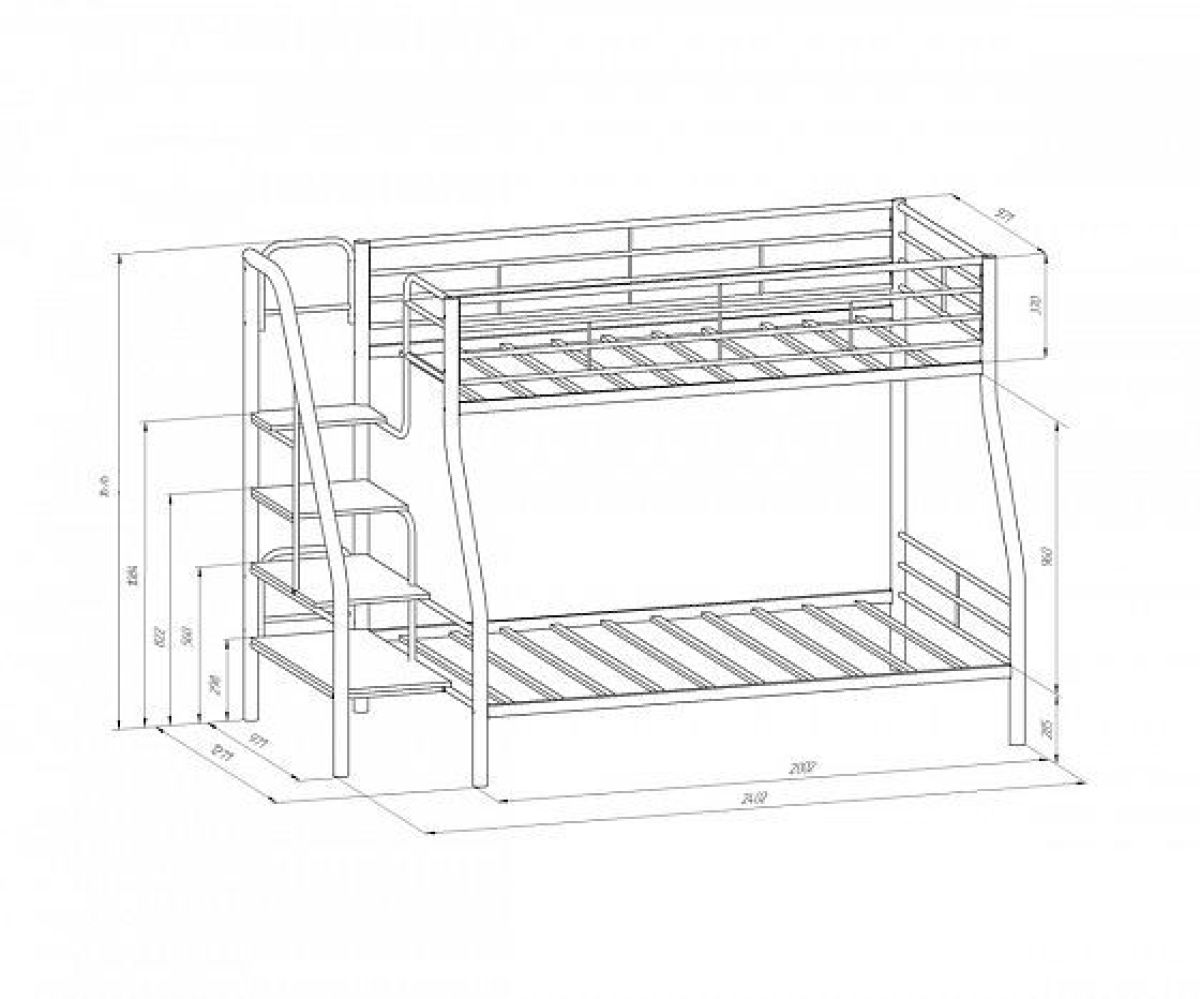 Конструкция кровати предусматривает два спальных места размером: 90*190 см - верхнее, 120*190 см - нижнее. Верхнее спальное место защищено бортиками. Прочную лестницу с широкими ступенями можно установить справа или слева.