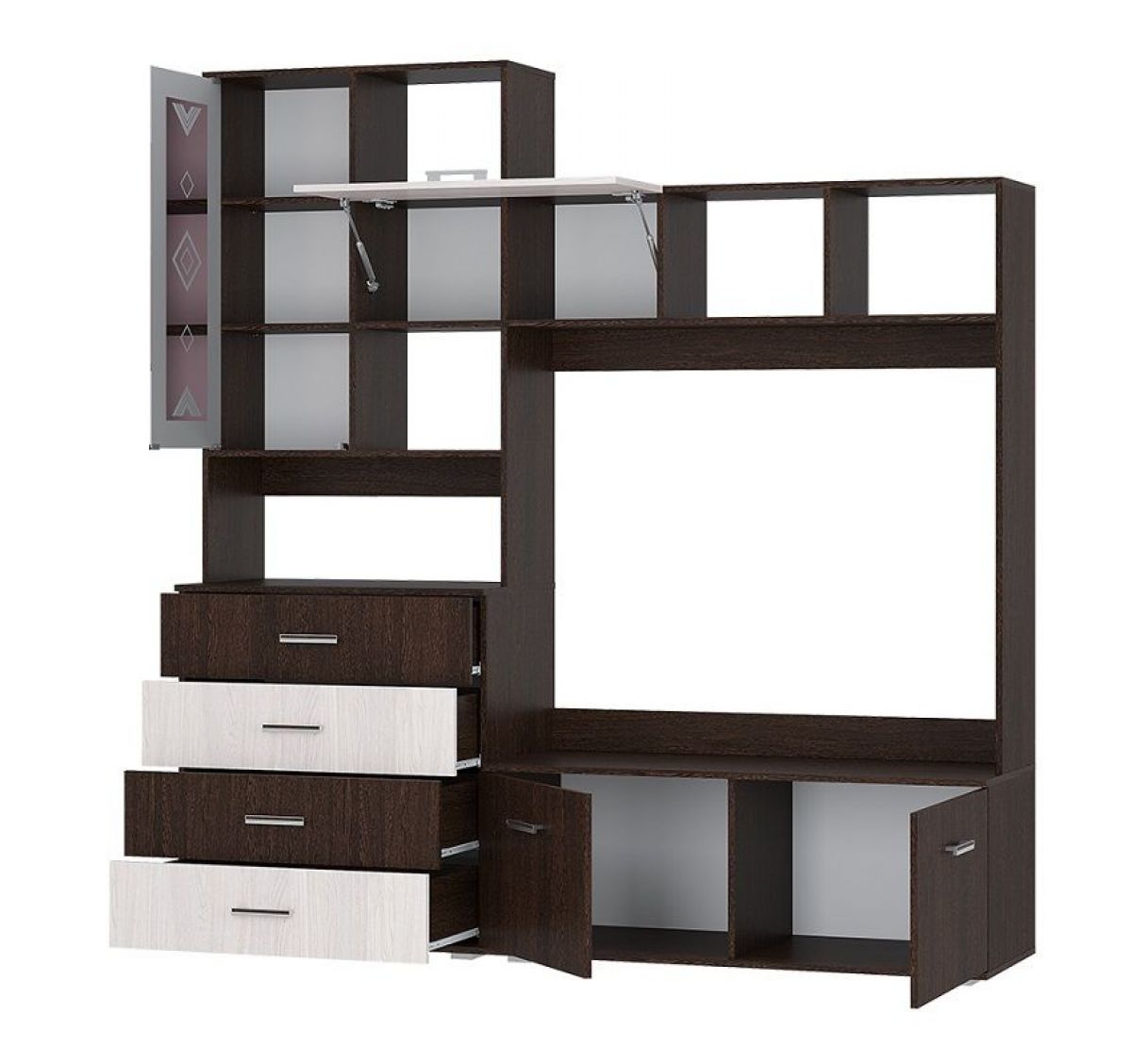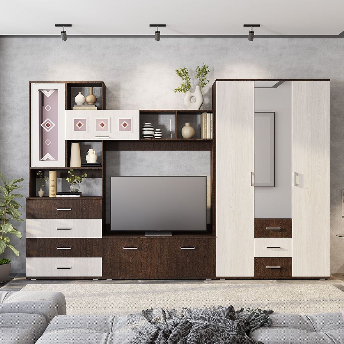 Модульная гостиная Белла - это функциональная стилизованная модель с простыми геометрическими формами. Особый шарм ей придаёт контрастное решение фасада в цветовом сочетании венге/дуб атланта, а также отделка зеркалами с фьюзингом (художественные вставки из цветного стекла), пескоструйной обработкой и еврокромкой.