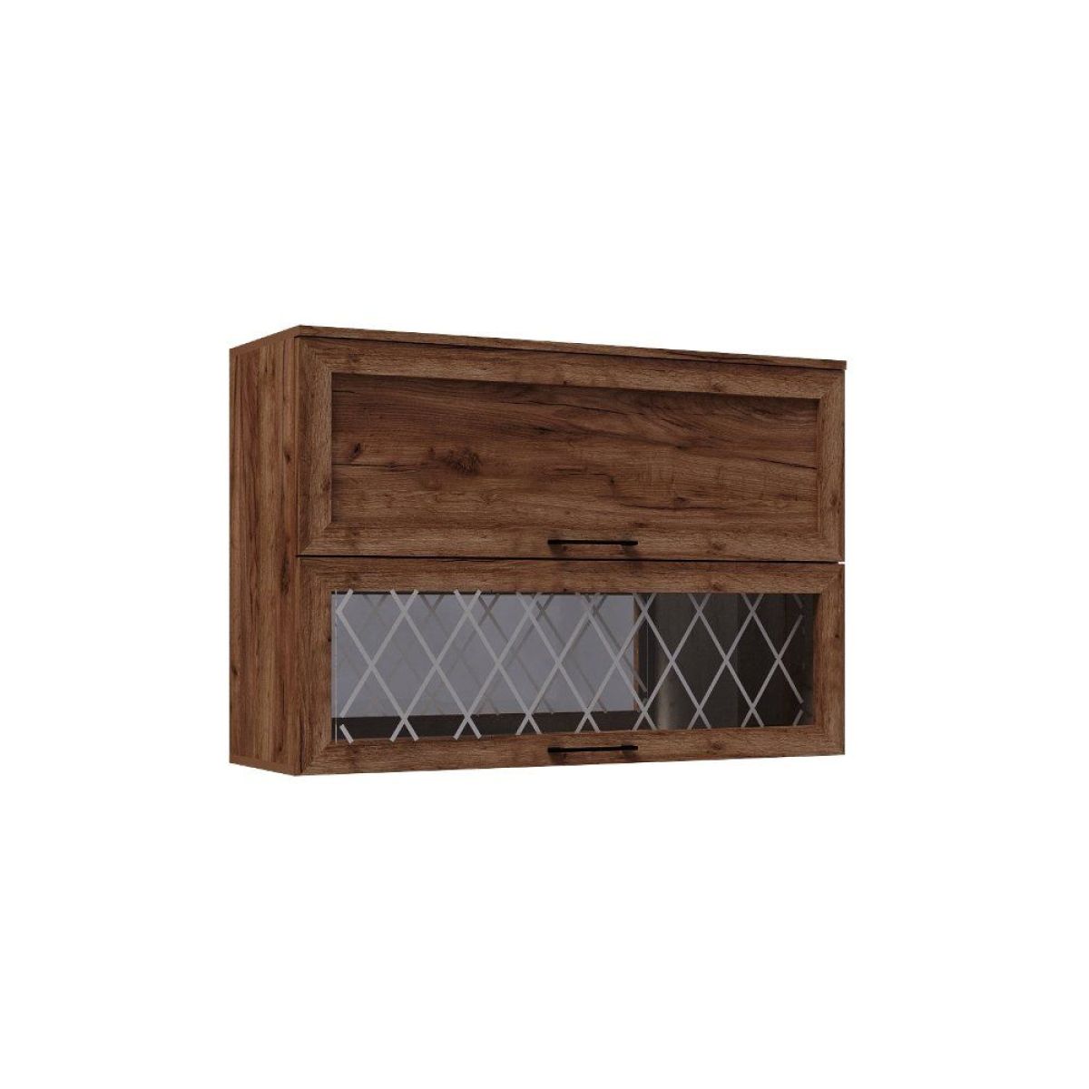 Фасадное стекло в витринах и полке навесной с гравировкой без полировки. В витринах стеклополки, на задних стенках зеркало.