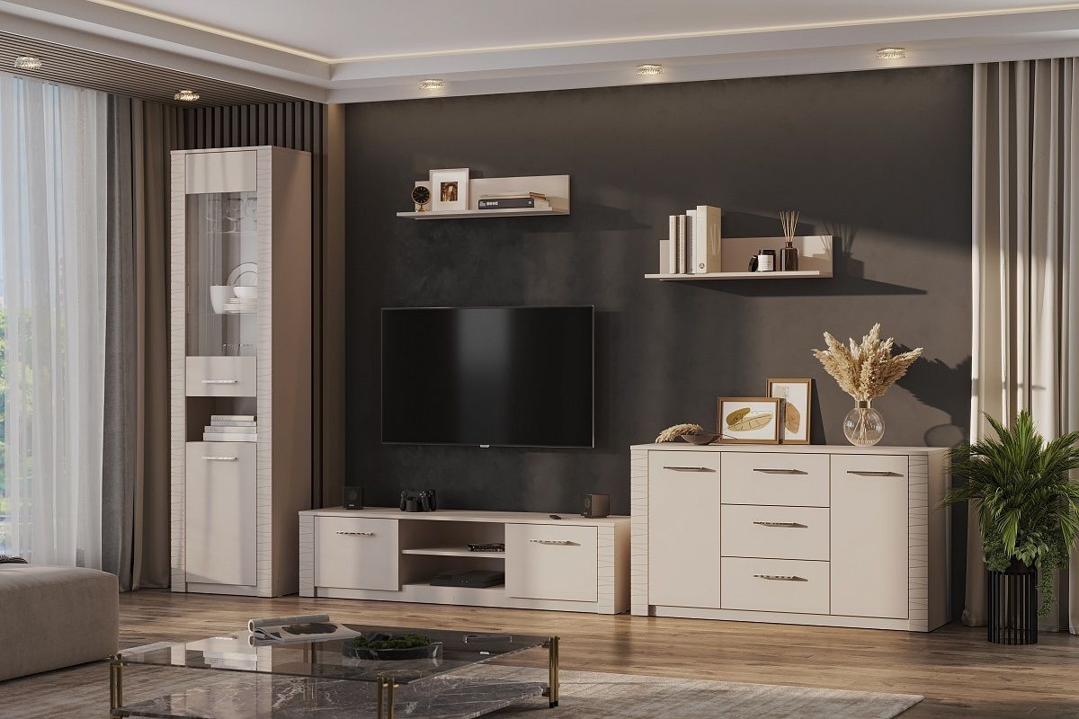 *Цена указана за модули: Комод 3 ящика двухстворчатый, Пенал со стеклом, Тумба для ТВА (1600), Полка навесная (комплект).