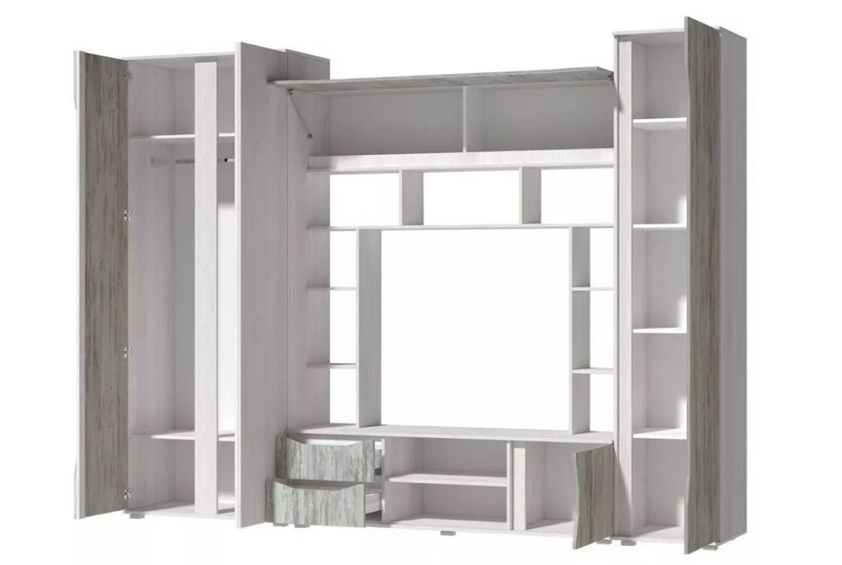 - Гостиная включает себя платяной шкаф, нишу под ТВ и пенал с полками