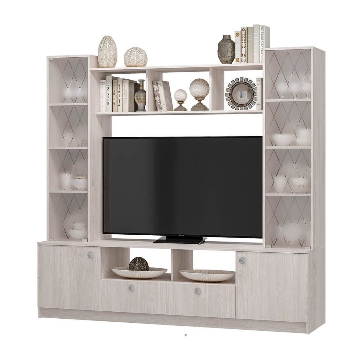 Модульная функциональная гостиная «Зарина», выполненная в классическом стиле, станет приятным акцентом в интерьере вашей квартиры. Спокойная древесная фактура цвета "ясень белый" делают модель изысканной и стильной. Стеклянные створки по бокам просторной зоны под ТВ придают визуальный эффект лёгкости и невесомости, подчеркивая изысканный вкус обладателя гостиной. Благодаря выбранному цвету пыли и грязи на ней совершенно незаметно, а это огромный плюс для домохозяек!