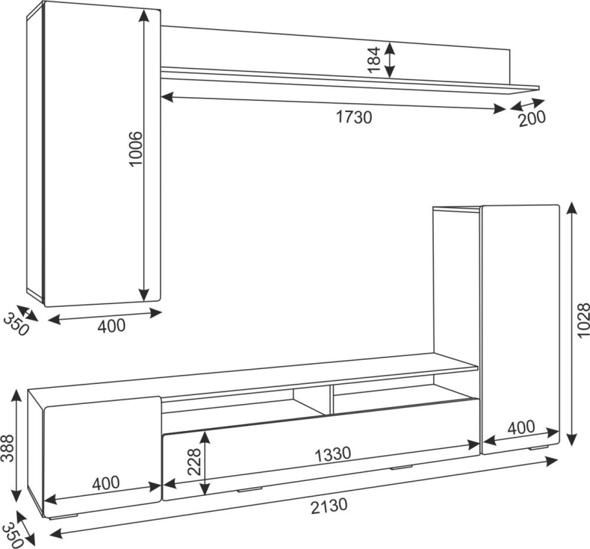 Габариты (Ш*Г*В): 2130*350*1028 (низ)/1006 (верх) мм