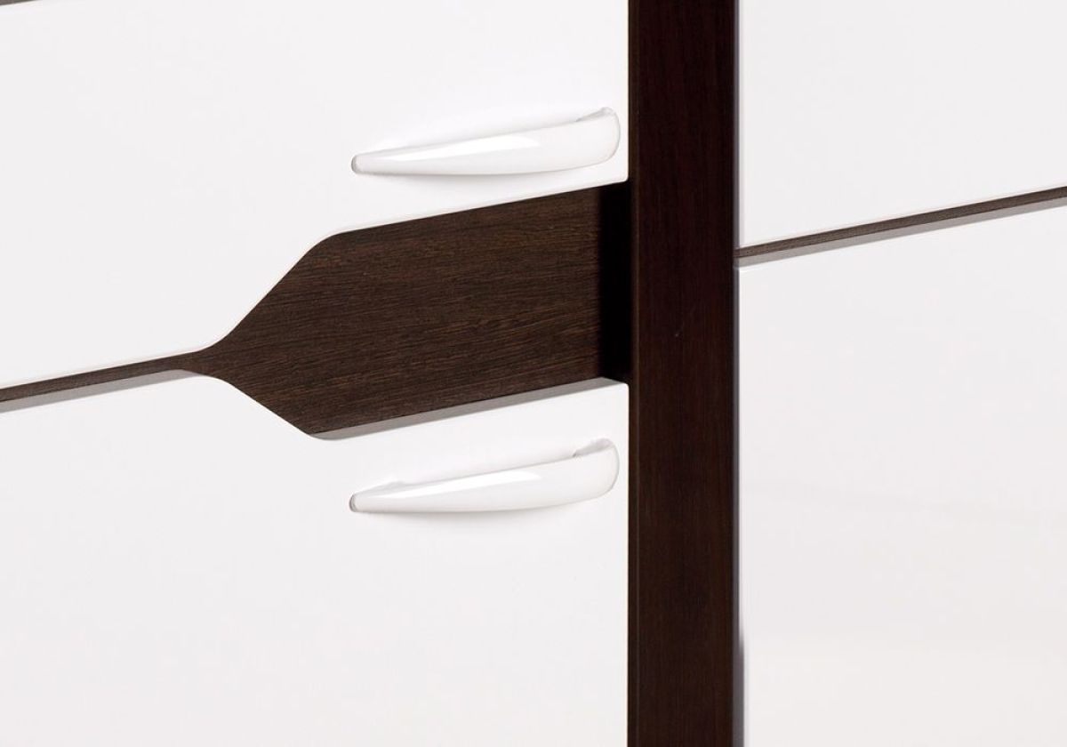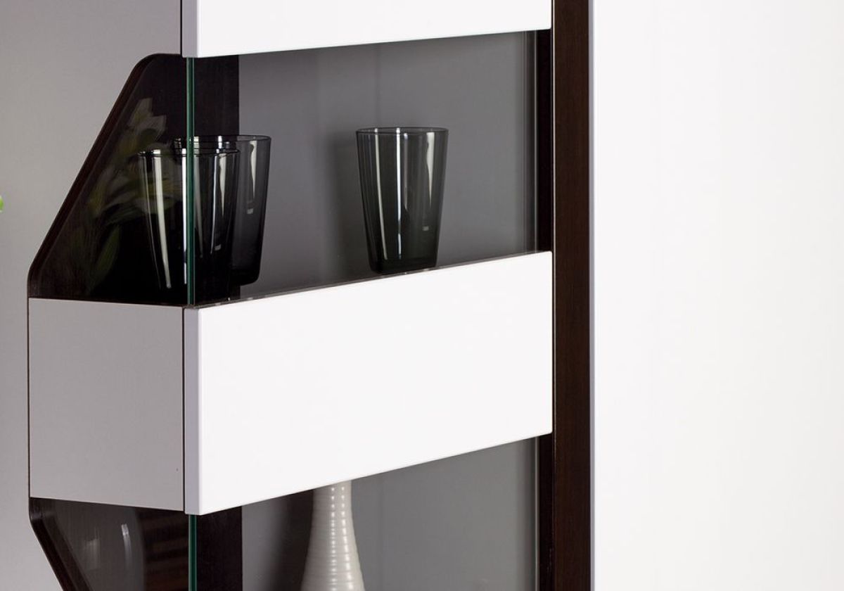 Благодаря сочетанию 2-х контрастных декоров – белого и венге с глянцевыми и матовыми поверхностями, а также оригинальному дизайну двухсторонних стеклянных витрин и декоративному приему стыковки модулей, «Ронда» выглядит эффектно и стильно. Завершают внешний облик белые глянцевые ручки итальянского производства.