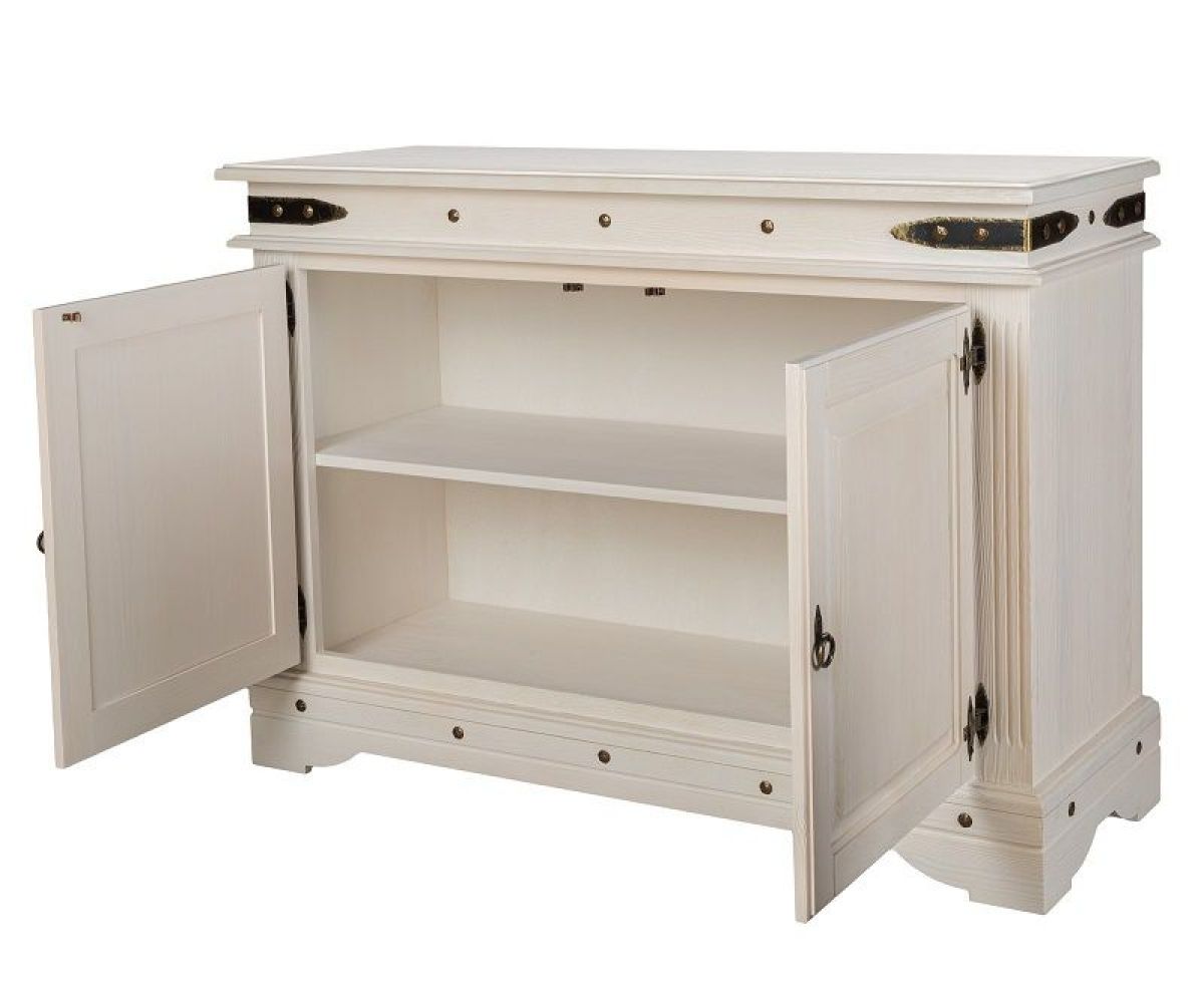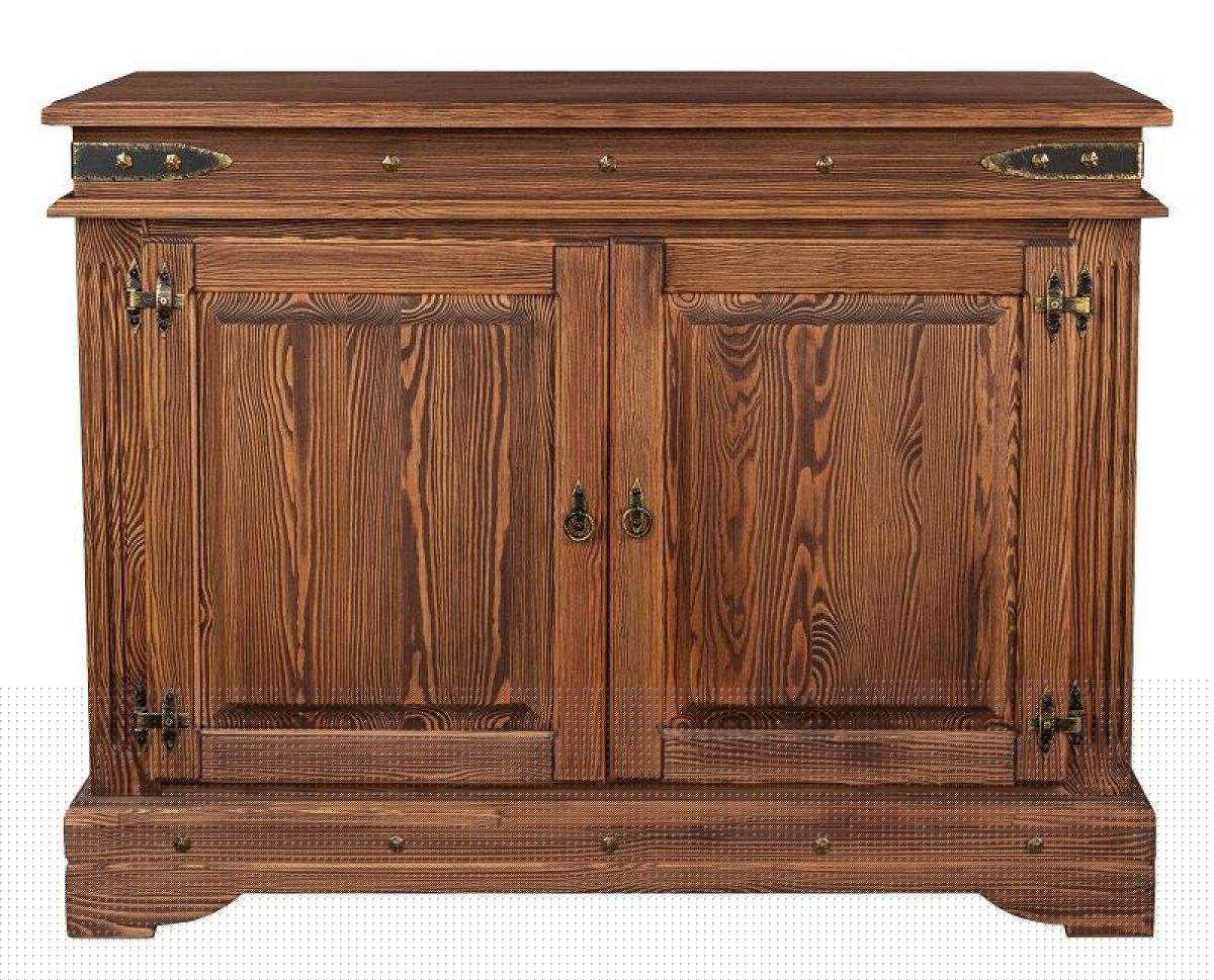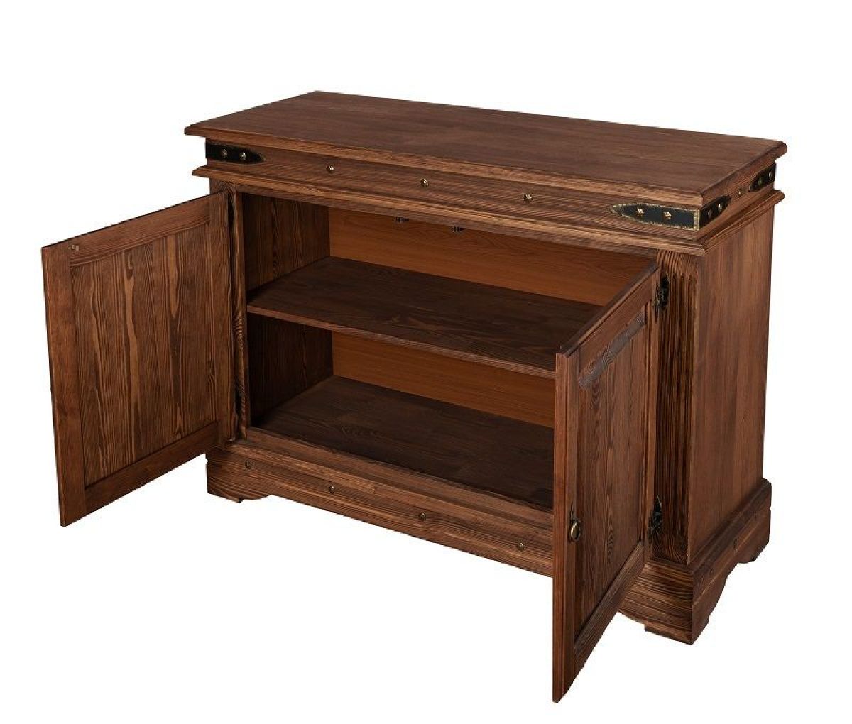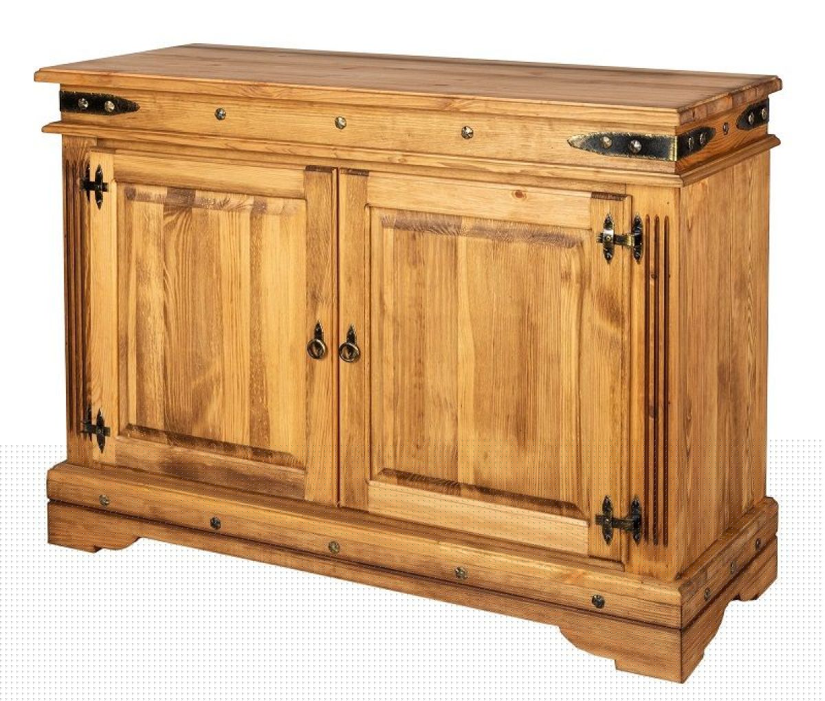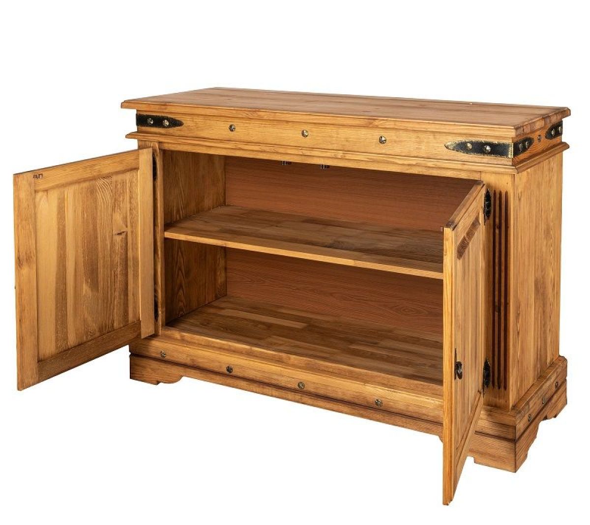 Небольшой комод для посуды впишется в интерьер столовой или кухни. Идеален для обустройства комнаты в загородном доме. Оборудован широкой полкой, скрытой за распашными дверцами с кованой фурнитурой. Благодаря компактному размеру, подойдет для небольшого помещения.