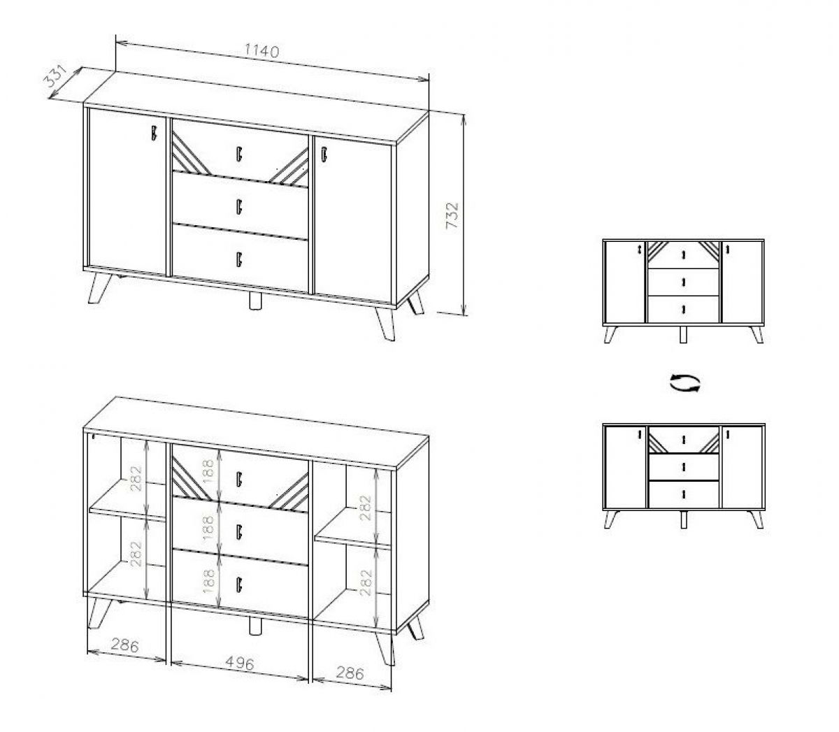 Комод двухстворчатый с тремя выкатными ящиками на шариковых направляющих.