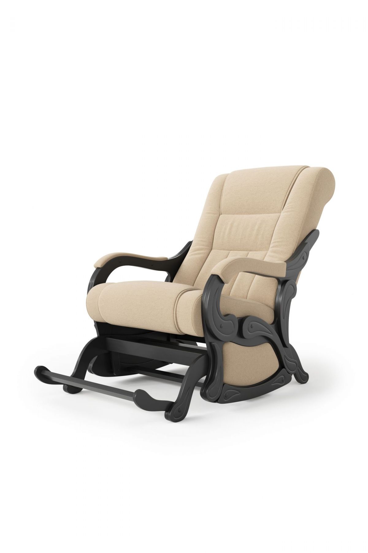 Для комфортного отдыха имеет маятниковый механизм , который выполняет классическую функцию покачивания, при этом она не оставляет вмятин на напольном покрытие. Кресло обтянуто искусственной кожей, смотрится современно и стильно, каркас-дерево, боковины выполнены в виде криволинейных деталей, образующих ножки-опоры, материал боковины фанера. На боковинах имеются мягкие подлокотники.