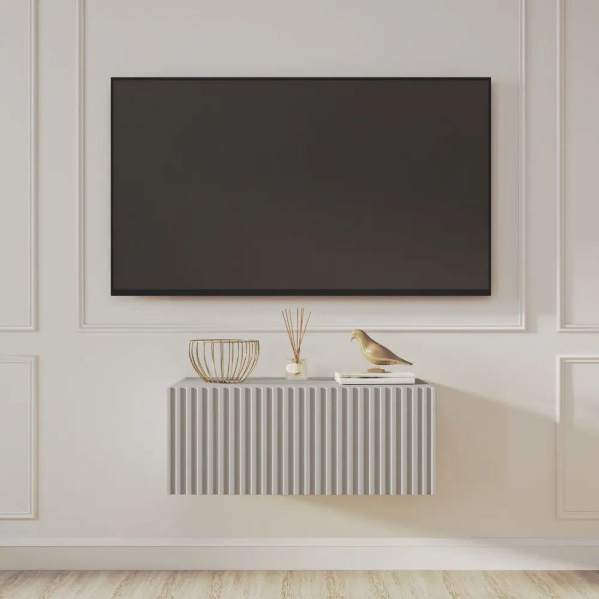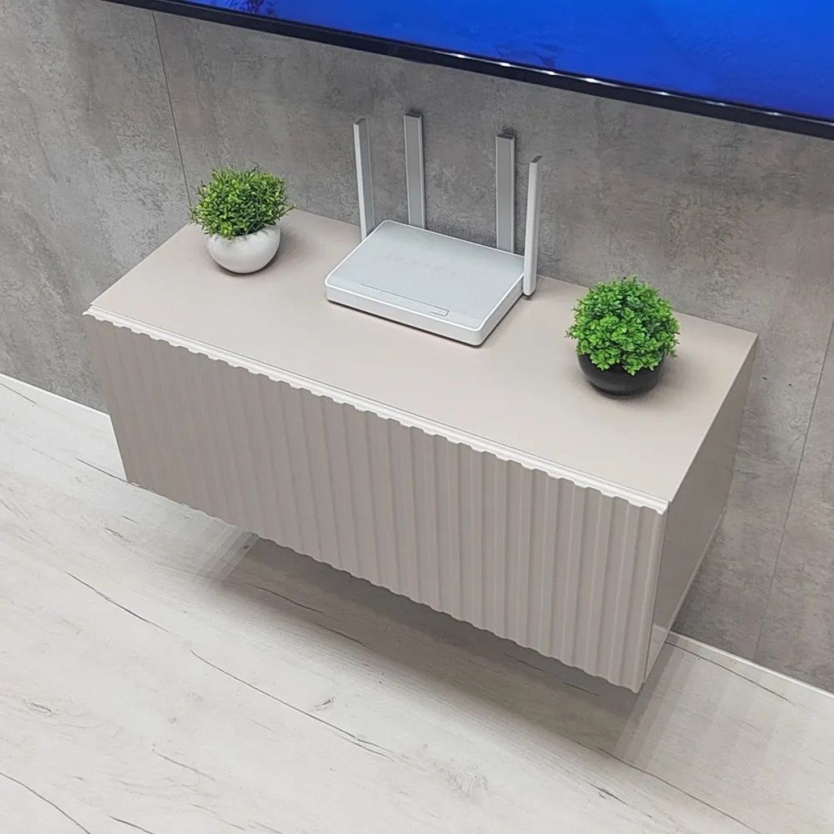 Благодаря своей компактности тумба под ТВ подвесная поможет сэкономить пространство, избежать ощущения загромождённости гостиной, спальни или детской комнаты, а рифлёный фасад будет акцентировать