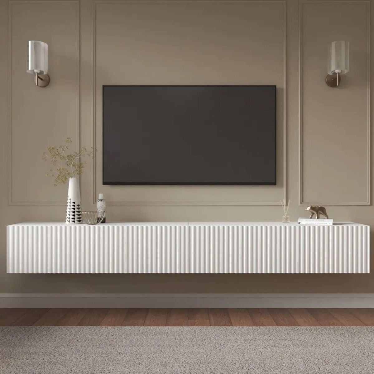 Благодаря своей компактности тумба под ТВ подвесная поможет сэкономить пространство, избежать ощущения загромождённости гостиной, спальни или детской комнаты, а рифлёный фасад будет акцентировать
