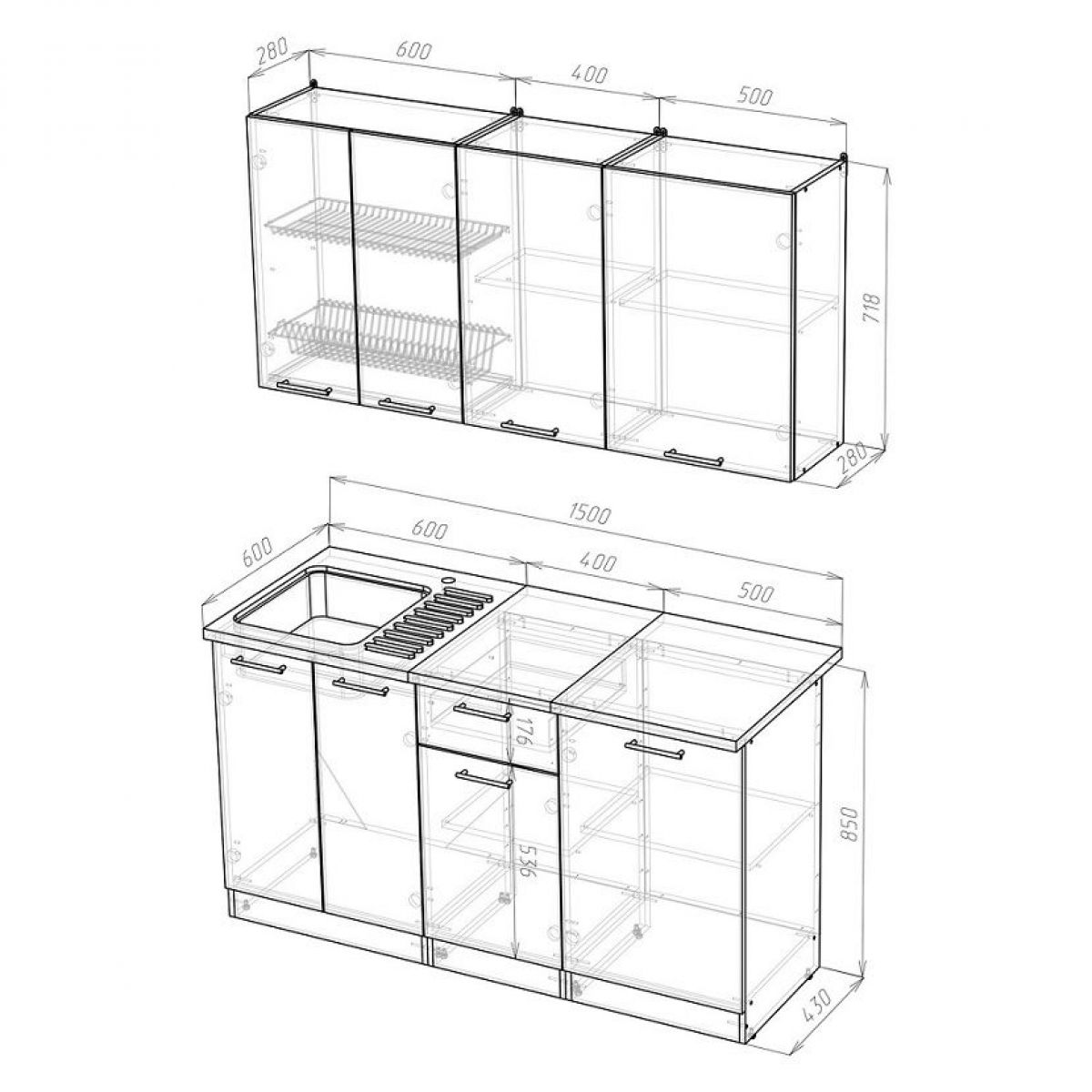Ширина: 1500 мм; Глубина: 600 мм (со столешницей)