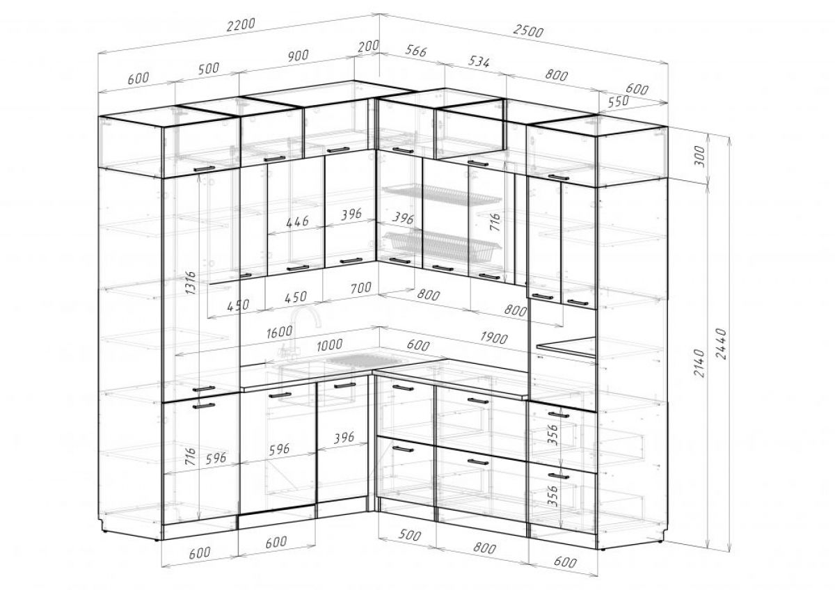 Ширина: 2200*2500 мм; Глубина: 600 мм (со столешницей)