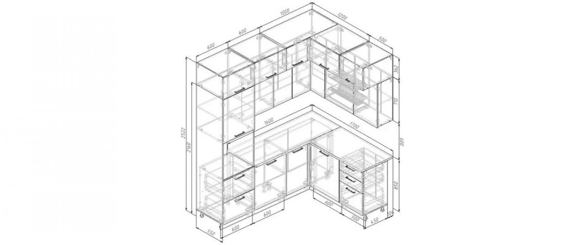 Модули первого верхнего яруса с фасадами со свесом 12 мм, что позволяет открывать их без установленных ручек.