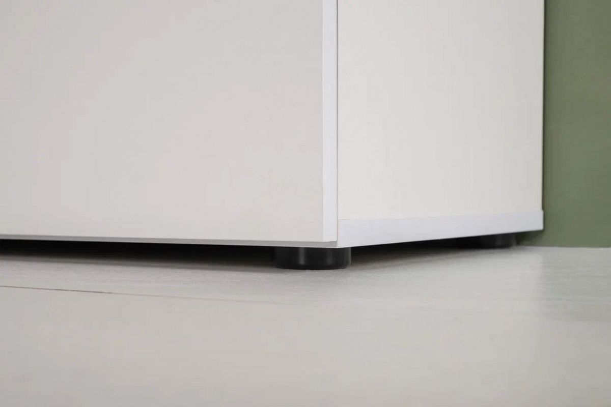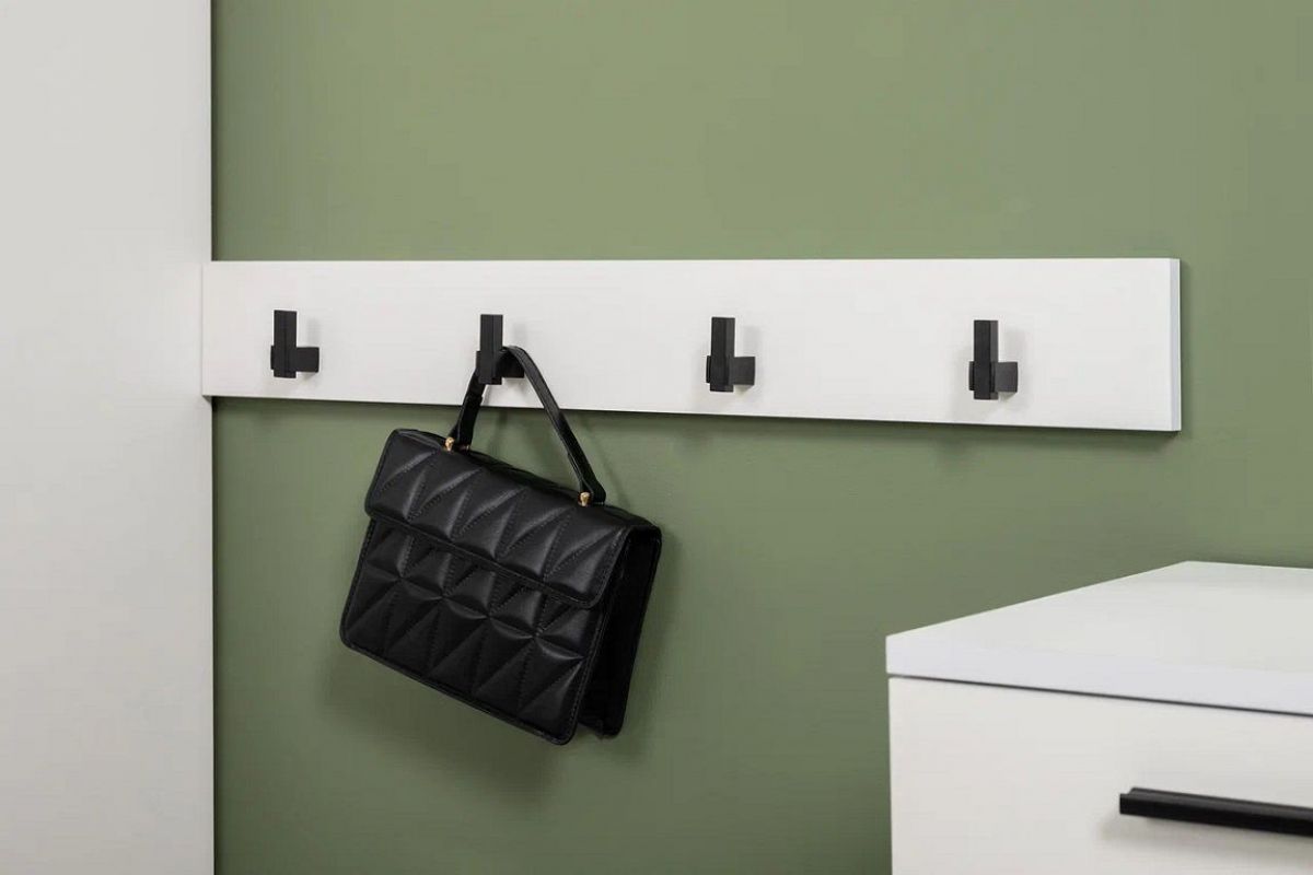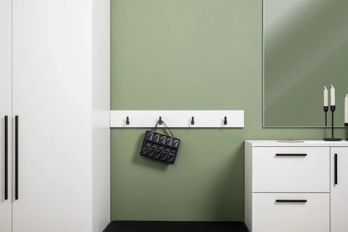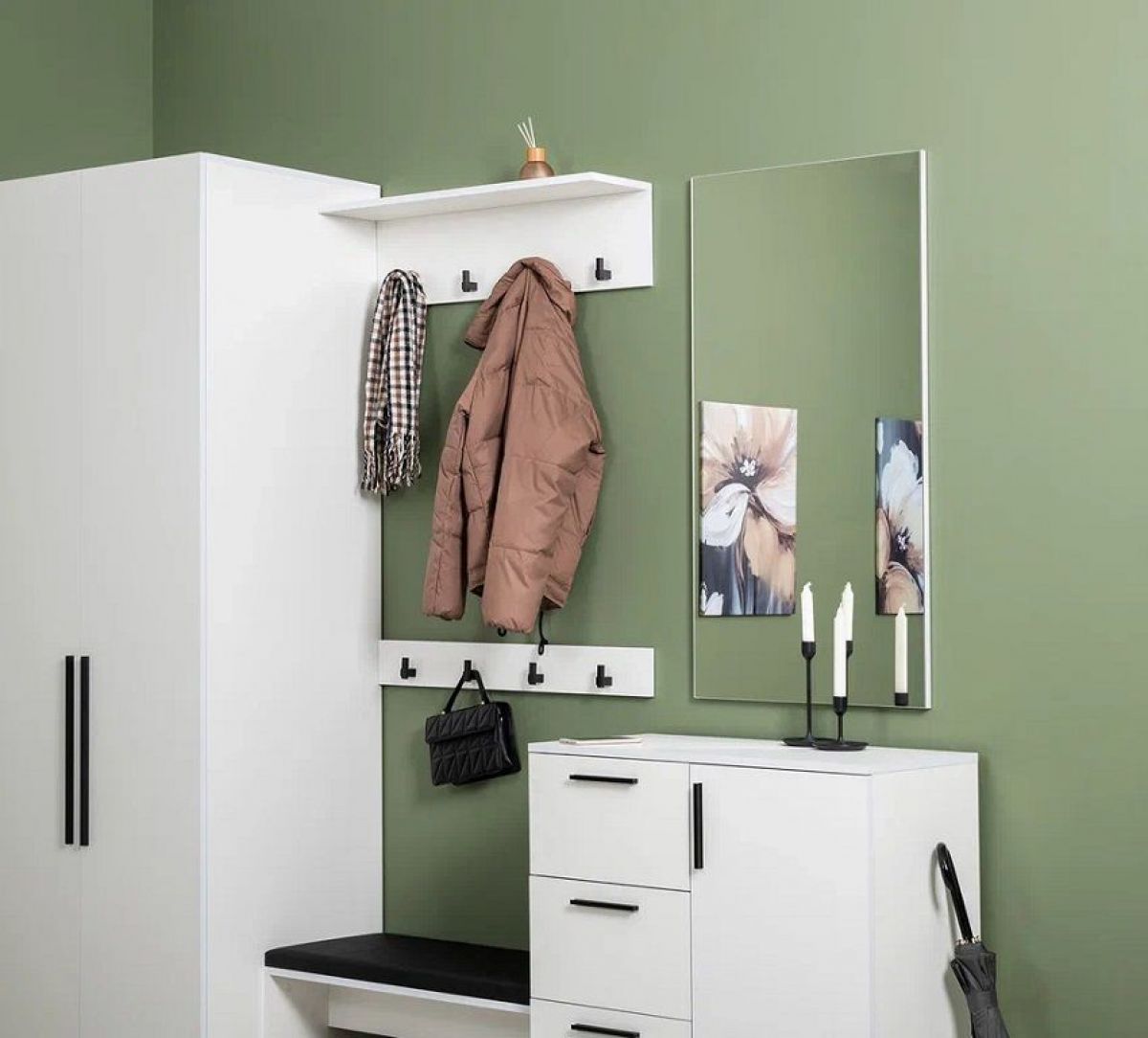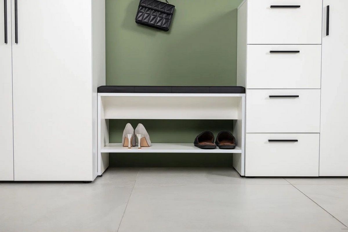 Нейтральный белый цвет визуально расширит ограниченное пространство прихожей. Мягкое сиденье на тумбе для обуви