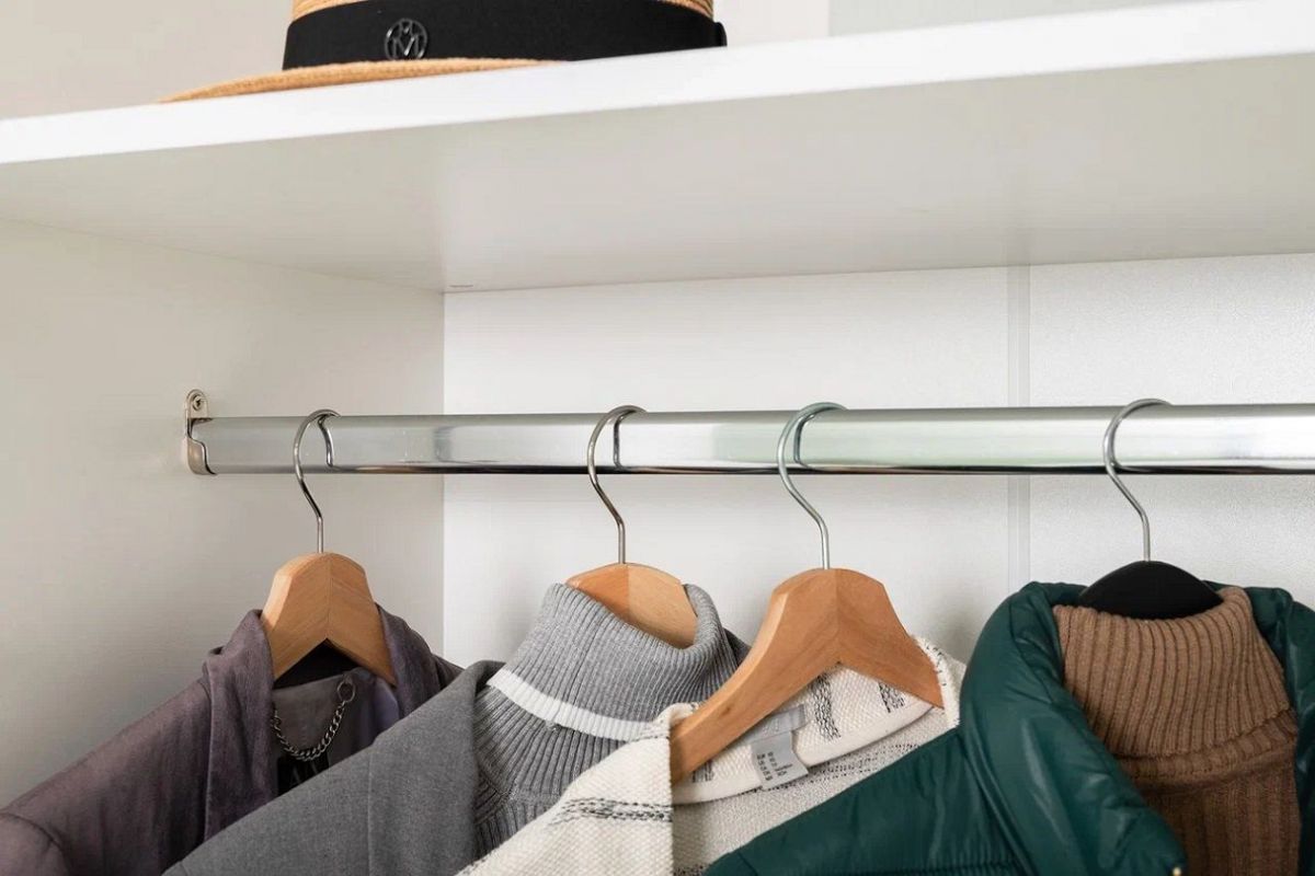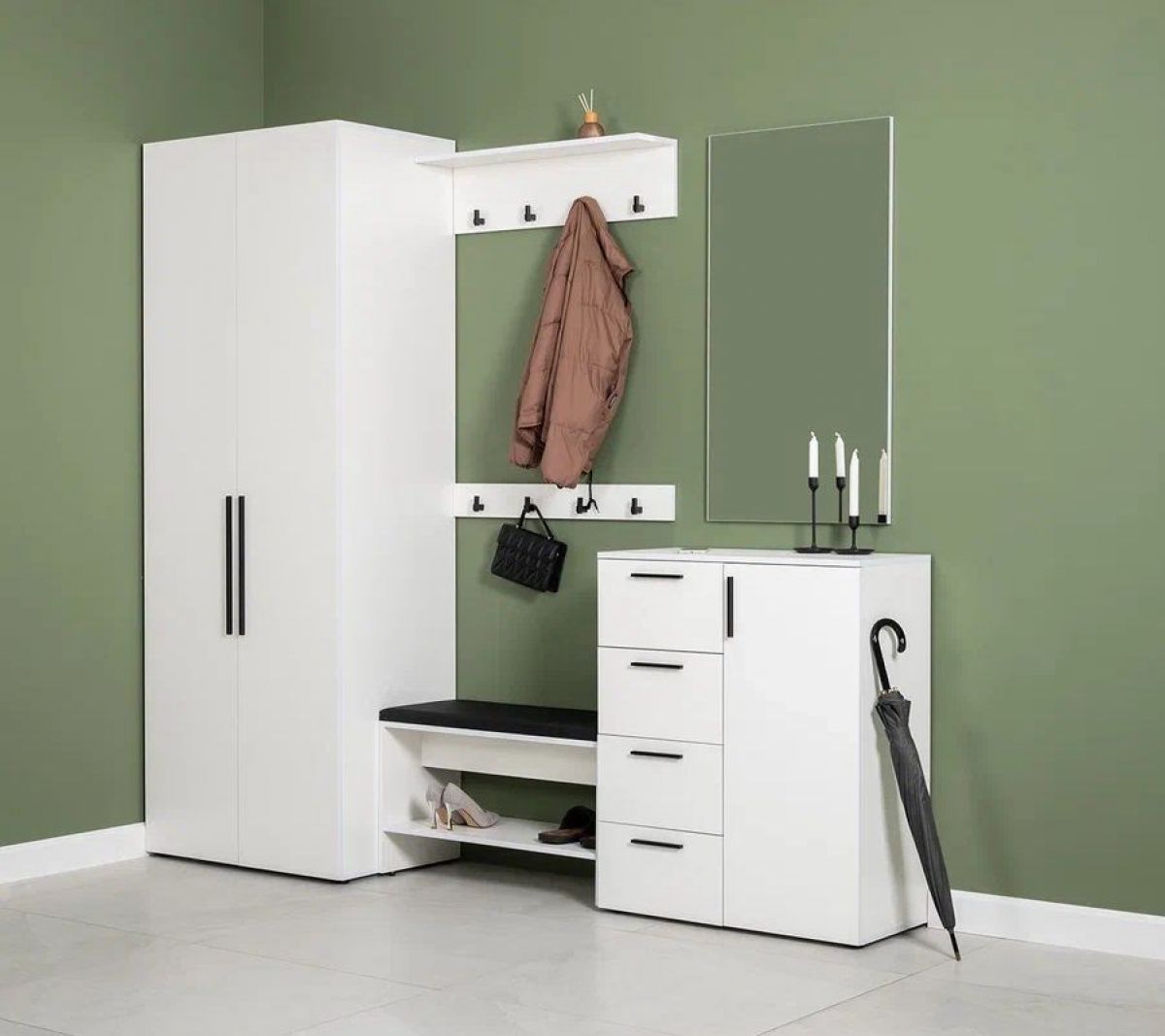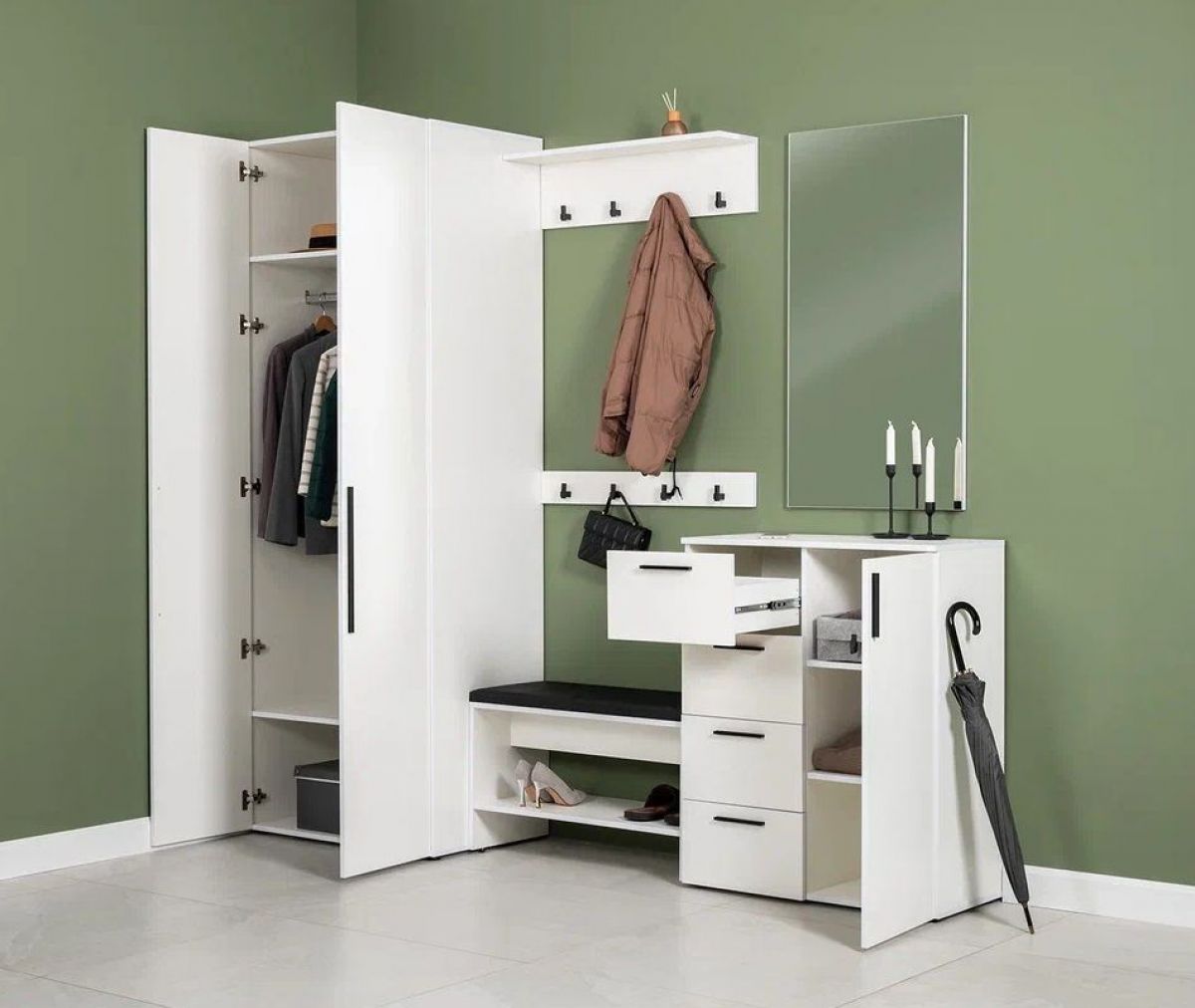 Вместительный шкаф полноразмерной глубины можно дополнить тумбой для обуви с мягким сиденьем и нишами для хранения, зеркалом и минималистичными вешалками.