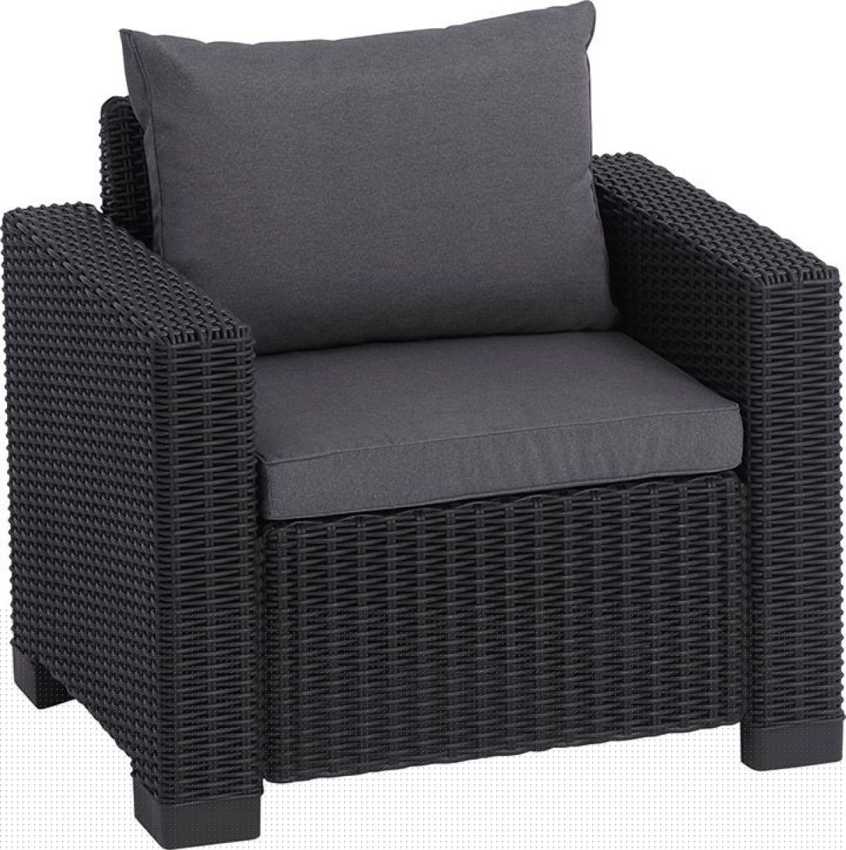 С ранних утренних часов до позднего ночного времени Вы можете отдыхать и расслабляться в комфортном кресле Калифорния. Стильная текстура, имитирующая ротанговое плетение, исключительно широкие подлокотники, подушки сиденья и спинки - благодаря им это кресло идеально подходит для того, чтобы отдыхать в летний день. А поскольку оно изготовлено из устойчивого к погодным условиям пластика с защитой от ультрафиолетового излучения, Вы будете им наслаждаться на протяжении многих сезонов, не заботясь об уходе.