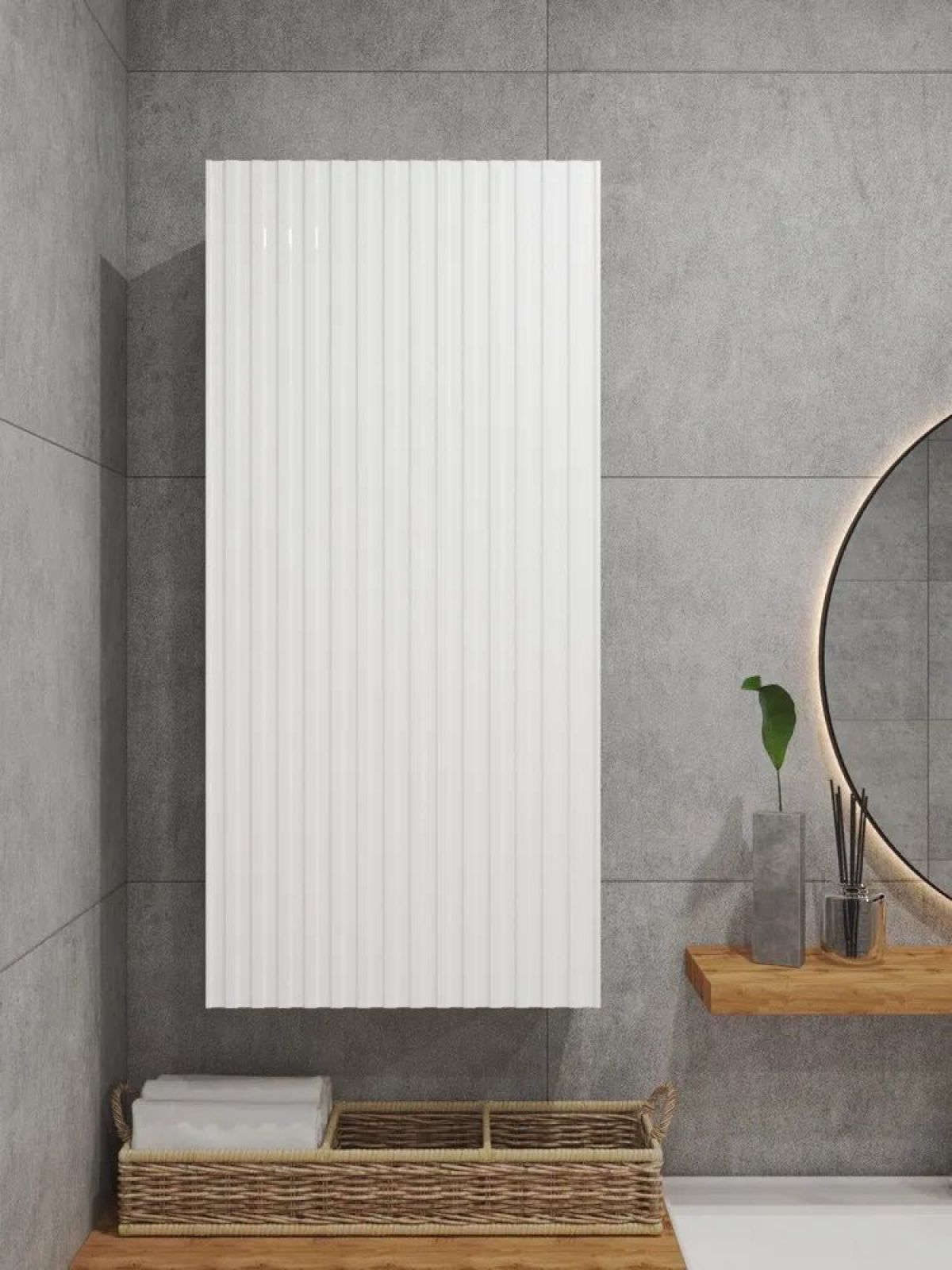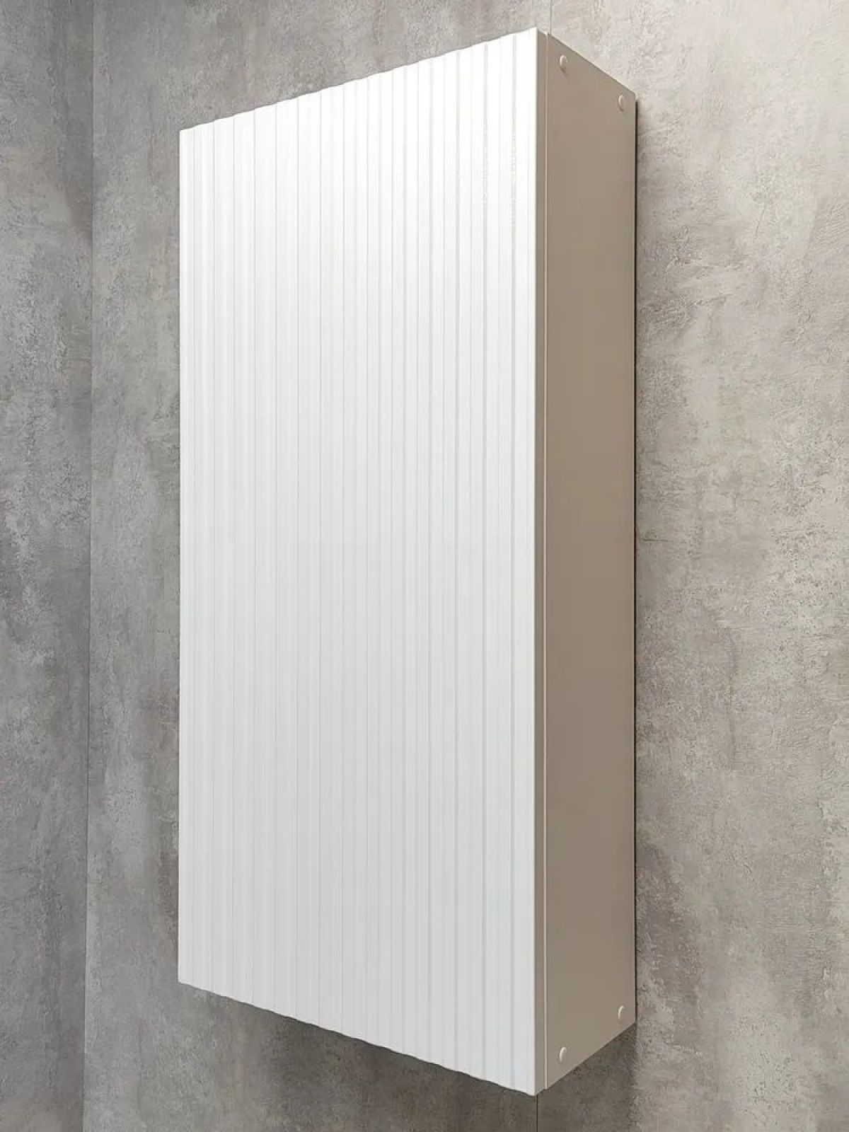 Белый шкаф с рифлёным фасадом будет отлично и стильно смотреться как в ванной, так и в туалете.