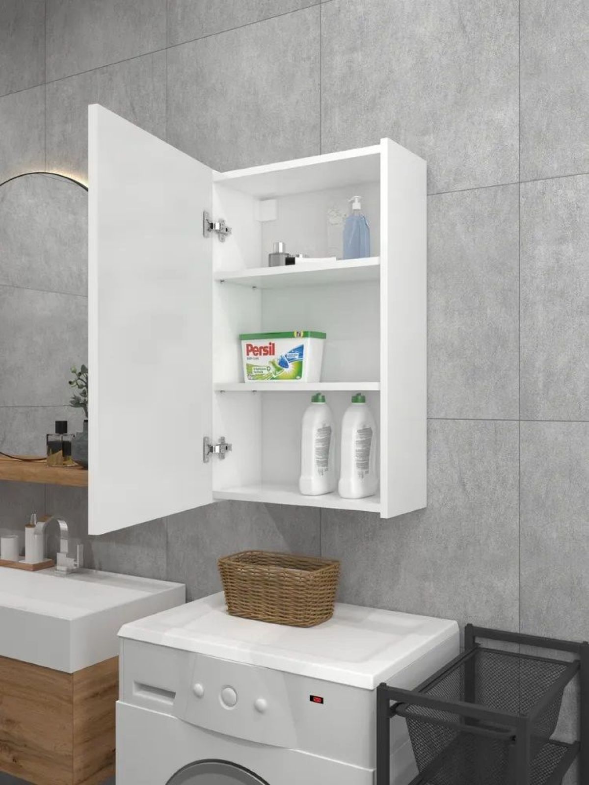 Полки в навесном шкафу регулируются по высоте.