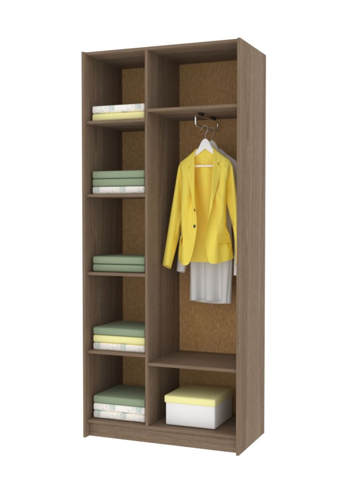 Вместительный шкаф с перегородкой. Одна секция шкафа представляет собой отдел с полками, а во второй расположена выдвижная штанга под одежду.