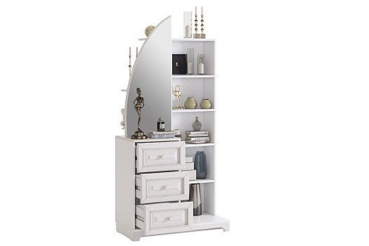 Состоит из: 3-х выдвижных ящиков, зеркала, стеллажа с полками, расположенный за зеркалом.