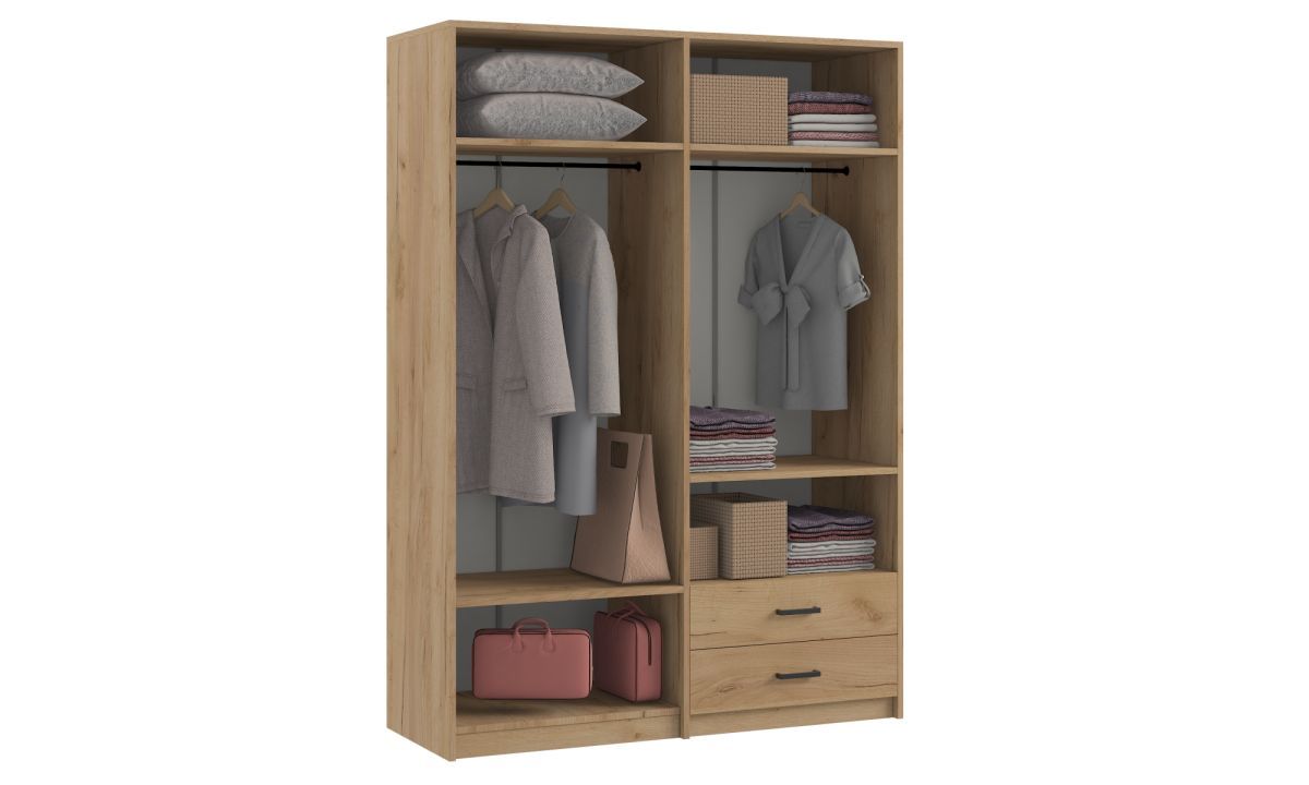 Имеет два отделения под одежду с антресольными полками и штангами под одежду