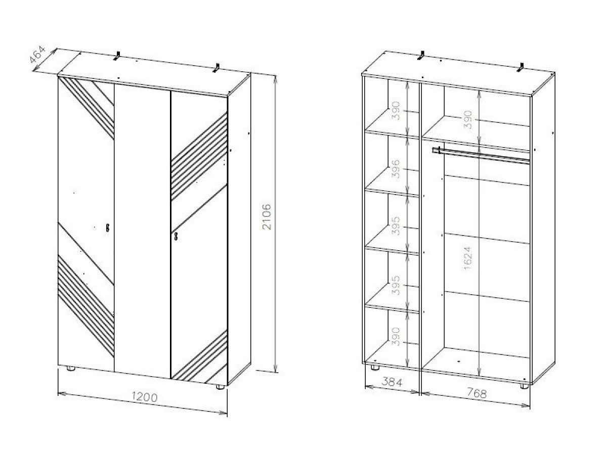 В левой части шкафа расположен отсек с четырьмя полками (одна стационарная и три съемных), в правой части шкафа расположен отсек со стационарной полкой и штангой (присадка под штангу отсутствует, покупатель устанавливает ее самостоятельно).