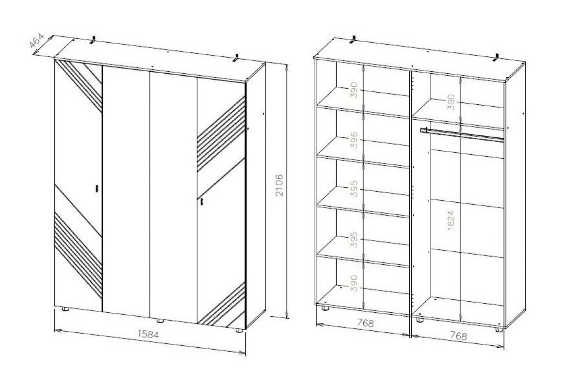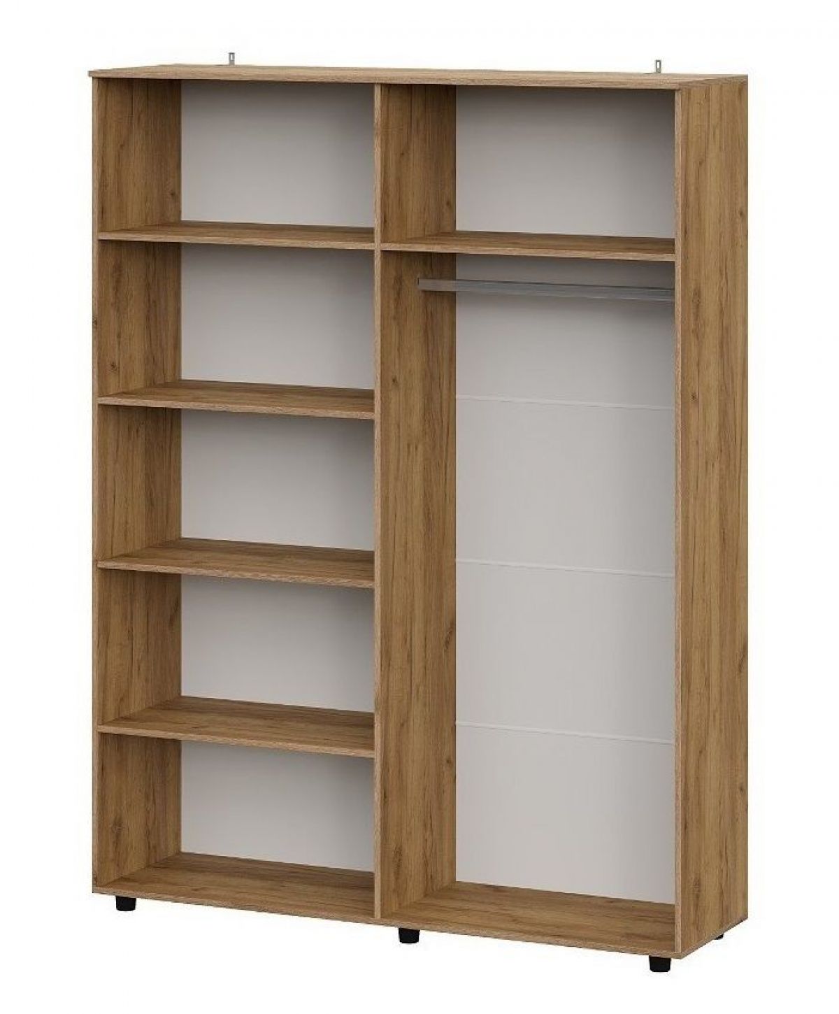 В левой части шкафа расположен отсек с четырьмя полками (одна стационарная и три съемных), в правой части шкафа расположен отсек со стационарной полкой и штангой (присадка под штангу отсутствует, покупатель устанавливает ее самостоятельно).