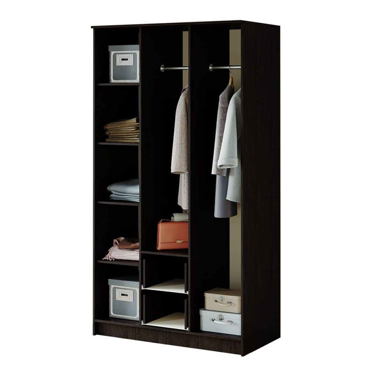 Красивая классическая модель трёхстворчатого шкафа Фиеста прекрасно впишется в интерьер спальни или гостиной. Центральная створка у модели – зеркальная, под ней находятся два выкатных ящика. Внутренняя комплектация состоит из отделений с хромированными штангами и зоны с полками для хранения трикотажа или белья. Шкаф выполнен в комбинации цветов венге и лоредо.